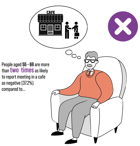 The data shows that people aged 55-69 were more than twice as likely to report meeting in a café as negative than people aged 25-34. This shows that the future of work has morphed and created new workplace trends, such as meeting out of the office in a non-corporate environment. If your business is not run out of a professional office, say a home office or coworking lounge, there are always options that can be taken to create a great first impression to a client, such as Servcorp Meeting Rooms. Meeting Rooms allow you to rent professional office spaces for meetings and other business activities, whether for an hour or for a day.